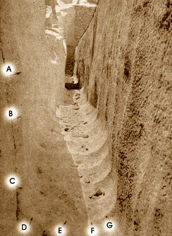Billedet stammer fra den sydlige grav. Det fremgår tydeligt af billedet, at graven er "fræset" ud af klippen ved hjælp af store, parvist arbejdende fræsetrisser. Fræsetrisserne er drevet nedefter fuldstændig vertikalt, og i bunden ses det, hvordan de to sidespor mødes, og derved dannes der en forhøjning (E på billede nr. 3). Denne forhøjning løber i hele gravens længde. Der findes 150 tilsvarende vertikale spor – side om side – i hver af gravene. Fræsesporene er angivet øverst til højre på billede nr. 2, hvor væggen E-G vises. Af spor i siderne i de tomme obelisklejer kan det ses, at obeliskerne løsnedes ved horisontale indfræsninger fra bunden af gravene, sådan som det er antydet ved snittet E-F på billede nr. 2.