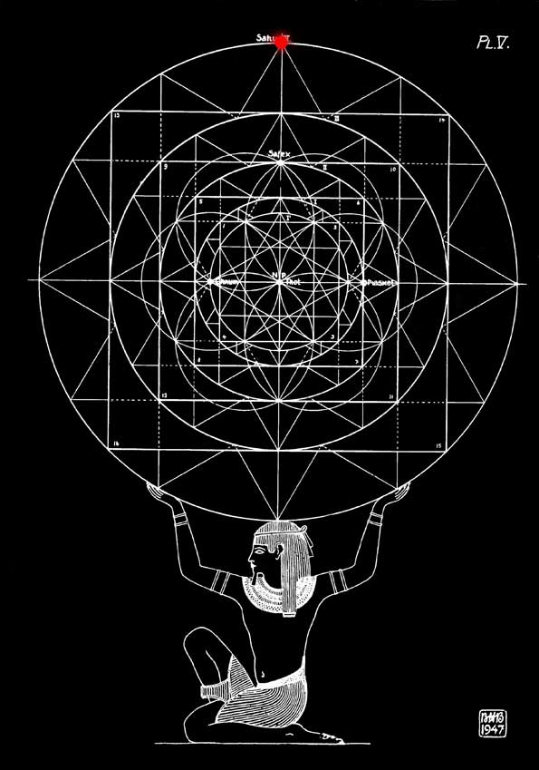 Udgangspunktet for konstruktionen er den netop omtalte tolvkant på planche IV, fig. 3. De tolv spidser på figuren er sammensat af små ligesidede trekanter, der ligger mellem cirklerne I og II. Disse cirkler kan siges at være forbundet med hinanden ved en tolvstjerneprogression. Denne tolvstjerne overføres til planche V, og her ser man, at tolvstjerneprogressionen også kan opfattes på en anden måde. Som allerede nævnt opstår tolvstjernen ved fire ligesidede trigoner. De horisontale og de vertikale grundlinjer i disse trigoner danner et kvadrat med hjørnepunkterne 1, 2, 3 og 4, og gennem disse går cirkel I. Når denne cirkel tegnes om et kvadrat, vil dette kvadrats hjørner 5, 6, 7 og 8 ligge i den første tolvkantcirkel II.