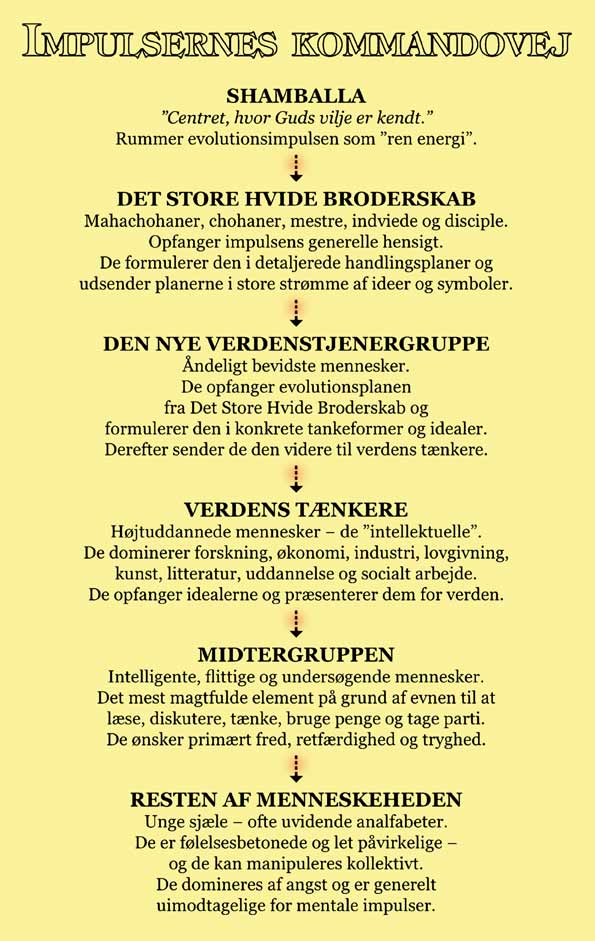 Hvis den guddommelige plan for evolutionen og hensigten med livet allerede er tænkt og tilgængelig, er det relevant at spørge, hvordan ideerne manifesteres på tilværelsens forskellige niveauer. I åndsvidenskaben beskrives impulsernes kommandovej her på planeten på denne måde: