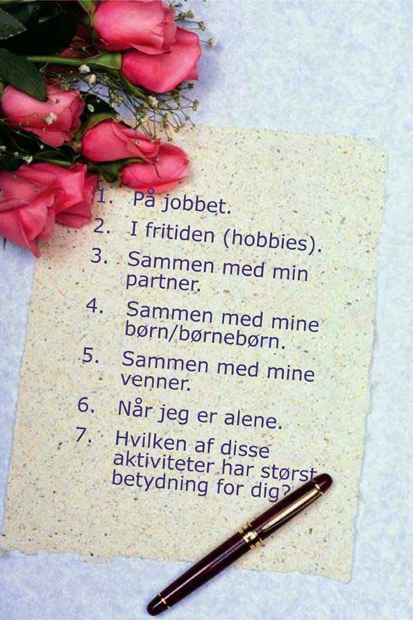 Skriv derfor en ”det-gør-jeg liste” med en kort beskrivelse af, hvad livet fyldes med på disse hovedområder: