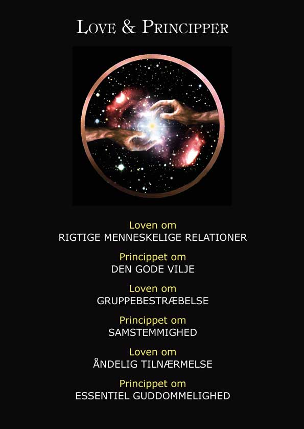 Ifølge åndsvidenskaben er det disse tre love og tre principper, der skal manifesteres i menneskets verden i Den Nye Tidsalder. De baserer sig på fortidens love og principper, men tilføjer det nye, der er behov for i nutiden. Loven om rigtige menneskelige relationerLoven om rigtige menneskelige relationer eller de forhold, der forbinder menneske med menneske, er for alvor kommet i fokus hos mennesker, der interesserer sig for menneskers sociale vilkår og for verdensfred. Rigtige menneskelige relationer er et nøgleord for Den Nye Tidsalder. Det er en lov, de fleste umiddelbart kan forholde sig til. Rigtige menneskelige relationer skaber et nært samspil mellem kærlighed og intelligens. Det er en lovmæssighed, der kommer til udtryk som medfølelse, selvforglemmelse, harmløshed og inklusivitet. Disse kvaliteter bringer mennesker sammen i arbejdet for fred og bedre vilkår for menneskeheden, og derfor vil denne lov uundgåeligt komme til udtryk i et ansvarligt samfundsengagement. Princippet omden gode viljeLoven om rigtige menneskelige relationer belives af princippet om ”god vilje”. ”God vilje” er den positive energi, der kan forvandle verden. Den grundlæggende intention i alt, som mennesker foretager sig, er god. God vilje åbner døren til kommunikation, samarbejde og forståelse. God vilje er en magnetisk kraft, der tiltrækker ideer, tanker, følelser og handlinger til gavn for helheden. God vilje er derfor en inspirativ kraft, der opløfter og hjælper andre. Betydningen af loven om rigtige menneskelige relationer og den gode vilje er allerede anerkendt. Menneskeheden er ved at forstå, at disse kvaliteter er en forudsætning for løsningen af nutidens problemer, hvad enten de viser sig i familielivet, i det politiske liv eller i det sociale liv. Loven og dens principper er stadig en videnskab, der er under udvikling på det sociale område, i psykologien og inden for andre områder, som ser rigtige relationer i et nyt perspektiv. Loven om gruppebestræbelse”Gruppebestræbelse” − eller samarbejde for det fælles bedste − er en lov, der medfører, at flere går sammen i grupper for at målrette energierne mod et fælles åndeligt mål. Med grupper menes der ikke et antal enkeltpersoner, der samles på det fysiske plan. En gruppe kan dybest set defineres som et formål eller en fælles hensigt, og når energierne forenes i forsøget på at nå et fælles mål til gavn for helheden, skabes der en synergieffekt, og gruppens energi bliver mere end summen af de enkelte medlemmers energi. Gruppearbejde er pionérarbejde, og den fælles bestræbelse forstærker respekten, kærligheden og samspillet i gruppens banebrydende arbejde. Overalt ser man denne lov i aktivitet. De mange humanitære grupper, der arbejder for at forbedre menneskehedens vilkår, er et synligt udtryk for denne lovmæssighed. Overalt ser man forsøg på samarbejde i grupper og enheder, selvom indflydelsen fra denne lov og dens princip ofte forvrænges og resulterer i ydre begrænsninger og påtvunget ensretning. Men modstanden mod krænkelsen af loven om frihed er også tiltagende. Værdien af individet på den ene side og dets integration i gruppen på den anden er ved at blive erkendt, og foreningen af individet og gruppen uden undertrykkelse af nogen af dem, ses som et vigtigt mål. Stadig flere grupper holdes sammen af aspiration og et indre fælles formål snarere end af en ydre, påtvungen målsætning. De ses overalt og i mange sammenhænge, og de holdes sammen af styrken i frivilligt accepteret samstemmighed. Princippet omsamstemmighedPrincippet, der beliver loven om gruppebestræbelse, er ”samstemmighed”. Kvaliteten udtrykker dybest set livets essentielle enhed. Samstemmighed er derfor en samlende kraft, som ophæver forskelligheder og integrerer gruppetænkningen. Man begynder nu at forstå både værdien af det enkelte individ og værdien af individets integration i en gruppeproces. Man har indset, at alle grupper holdes sammen af en indre, fælles motivation og ikke af ydre regler. Denne indre samstemmighed afbalancerer polariseringer og forvandler dem til glædesfyldt sameksistens. I Alice A. Baileys bøger har den tibetanske mester Djwhal Khul sagt, at en gruppes ydre aktivitet ikke er det væsentligste (selvom aktiviteten naturligvis har et vigtigt formål). Det er den samstemte, integrerede gruppetænkning og meditationsrytme, der effektivt skaber ændringer i menneskehedens bevidsthed. Loven om åndelig tilnærmelseLoven om åndelig tilnærmelse forbinder mennesket med sin højere bevidsthed. ”Åndelig tilnærmelse” er både en lov og en vej, der fører til sjælen og dermed til indre oplysning. I tilnærmelsen bliver lys til mere lys, livsmålet bliver højere, og indstrømningen af sjælens energier tiltager. I alle tider har mennesker fundet vejen til deres egen sjæl. De har fulgt denne vej. De har gjort sig modtagelige for sjælens impulser. Og de har accepteret sjælens betingelser og disciplin. Impulserne fra den indre guddommelighed er så subtile, at de knap nok sanses, men indstrømningen medfører en stadig klarere forståelse af sjælens hensigt. Den åbenbarer nye visioner og præsenterer mennesket for fremtidens planer og håb. Åndelig tilnærmelse er muligt for enkeltpersoner, for grupper og for hele menneskeheden som én samlet gruppe. Den individuelle tilnærmelse skal integreres med gruppens tilnærmelse, og gruppernes tilnærmelse vil engang i fremtiden blive organiseret som menneskehedens samlede tilnærmelse. Princippet omessentiel guddommelighedDet underliggende princip til loven om åndelig tilnærmelse er ”Essentiel guddommelighed” … og her er selve hjertet af lovene og principperne. Essentiel guddommelighed er den guddommelige livsgnist i ethvert menneske, og denne erkendelse åbner muligheden for aktiv deltagelse i et større liv end det nuværende. Samtidig vil man erfare, at oplevelsen af at mennesket er adskilt fra Gud, er en illusion − 