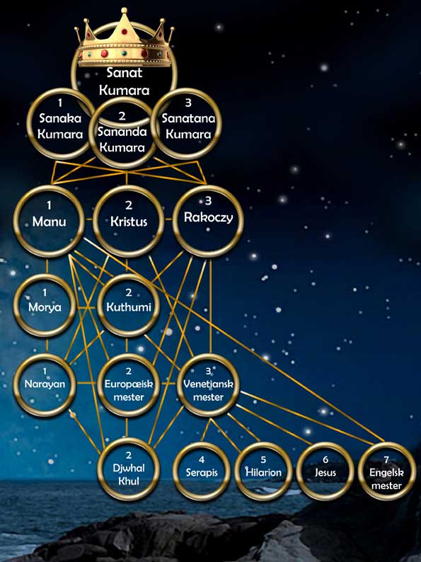 Øverst står lederen Sanat Kumara – Verdens indre konge – planetens guddom – "Vor Fader i Himlen", som religiøse mennesker har bedt til gennem de seneste 2.000 år. "I Ham lever vi, ånder vi og er vi",[1] står der i Bibelen, for hans aura omslutter og gennemtrænger alt på planeten. Han er en personificering af Gud på planeten Jorden og personificeringen af dens ånd. Hans tre brødre eller disciple er kumaraerne Sanaka Kumara, Sananda Kumara og Sanatana Kumara, og deres bevidsthed er rettet mod planeten og dens styring. De tre øvrige Kumaraer er Jata Kumara, Vadhu Kumara og Panchashikha Kumara, som har deres bevidsthed rettet mod højere bevidsthedsplaner.
