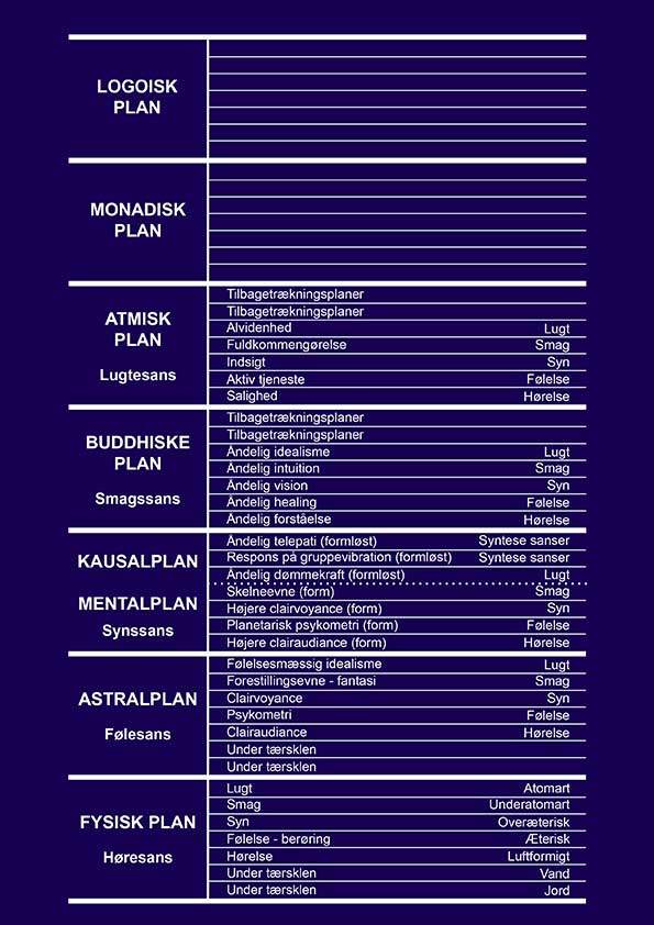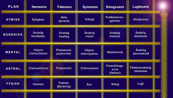 Planchen viser de forskellige evner på de syv bevidsthedsplaner. Bemærk at de sjælsegenskaber, der kaldes åndelig telepati og respons på gruppevibration, er såkaldte syntesesanser, der er et resultat af en sammensmeltning af alle fem sanser på sjælens eget plan – kausalplanet.